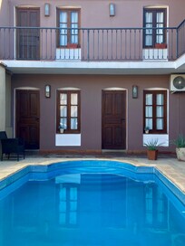 We had the high ceiling rooms that look very colonial. Such a beautiful place! Loved to chat across the wood frames and under the vines. It is a small and very convenient little hotel. If you are looking for cozy, colonial and convenient say no more. The pool was a nice touch. A bit too cold though. Oh the garage is really small, don’t count much on that. But parking over the street is OK.